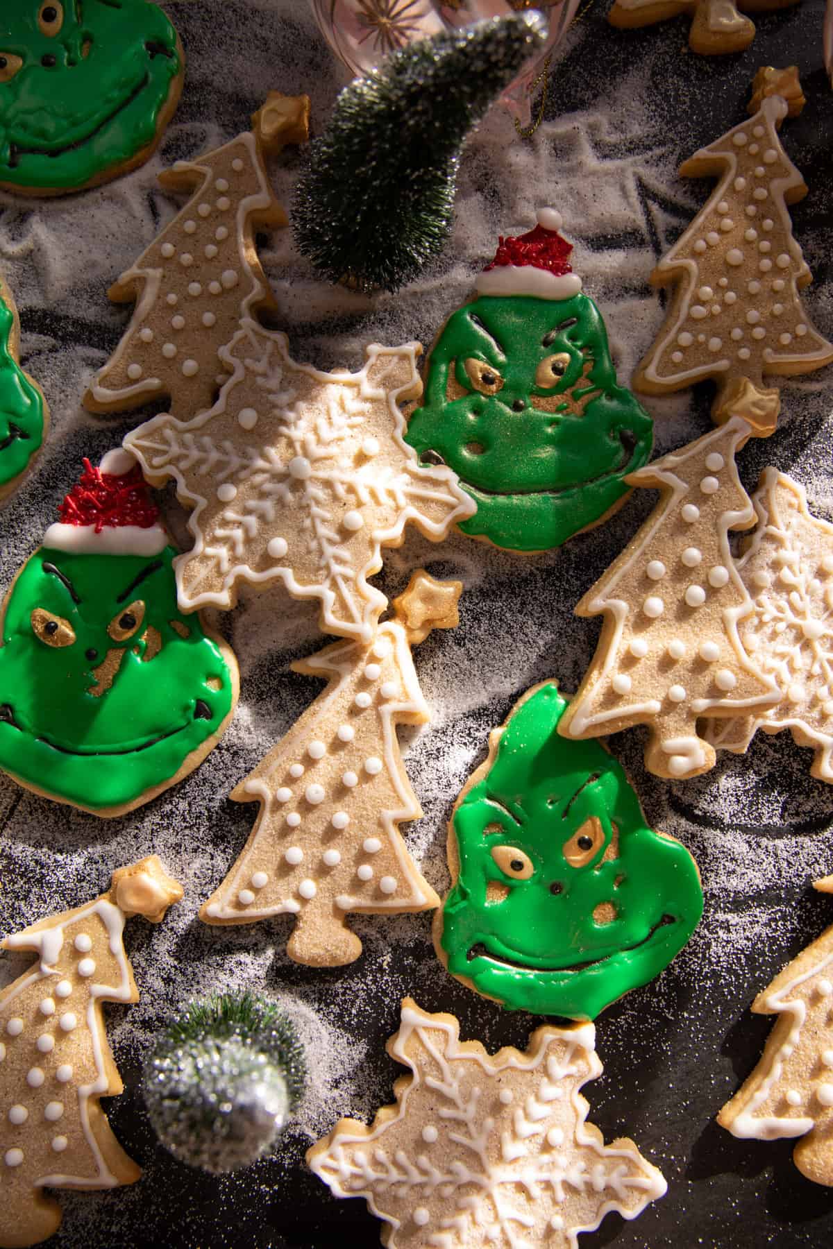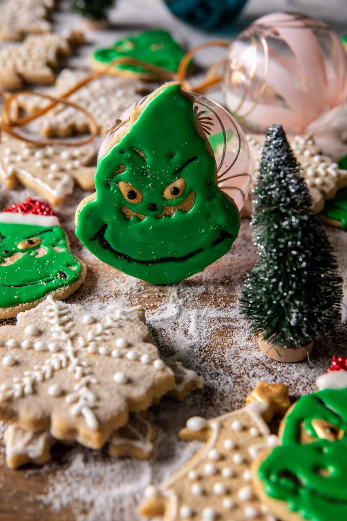 I used a snowflake and a holiday tree to cut my cookies. If you want a few fancier cookies mixed into the bunch, this is The Grinch cookie cutter set I used. Oslo is obsessed with Mr. Grinch, so I had to attempt to make at least a few Grinch cookies. We think they turned out cute! Not perfect, but cute, and fun!