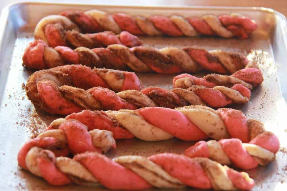 - Take one red and white white rope and pinch the tops together. Twist one rope around the other and seal the ends together. Place on baking pan and shape the long twist into a candy cane. Repeat with remaining twist. Sprinkle the cinnamon sugar that fell onto the counter all over the candy canes.