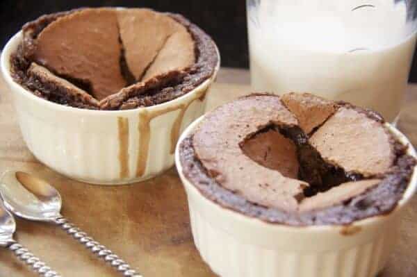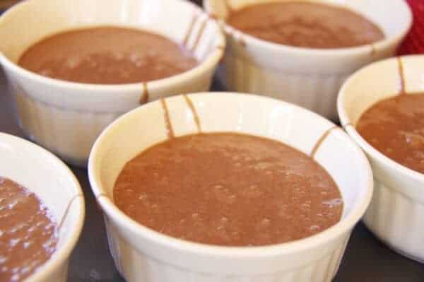- Place one dark chocolate square in each ramekin.