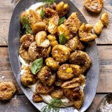The most perfect extra Crispy Salt and Vinegar Smashed Potatoes. Made simply with baby Yukon gold potatoes, vinegar, cheese, fresh herbs, plenty of flaky sea salt and black pepper. Each bite is perfect and so delicious. The secret? Cooking the potatoes in the instant pot first, smashing them, and then oven roasting them at high heat. Serve these crispy smashed potatoes over a bed of tangy Greek yogurt or sour cream for the perfect crunchy, to creamy balance. Simple and beyond good.