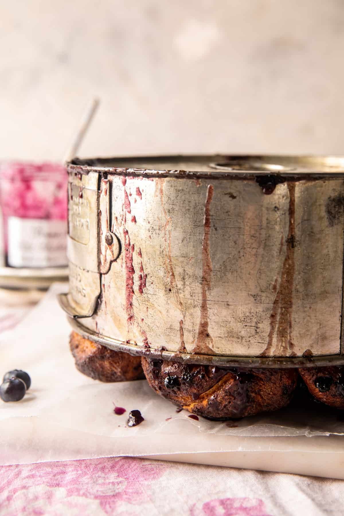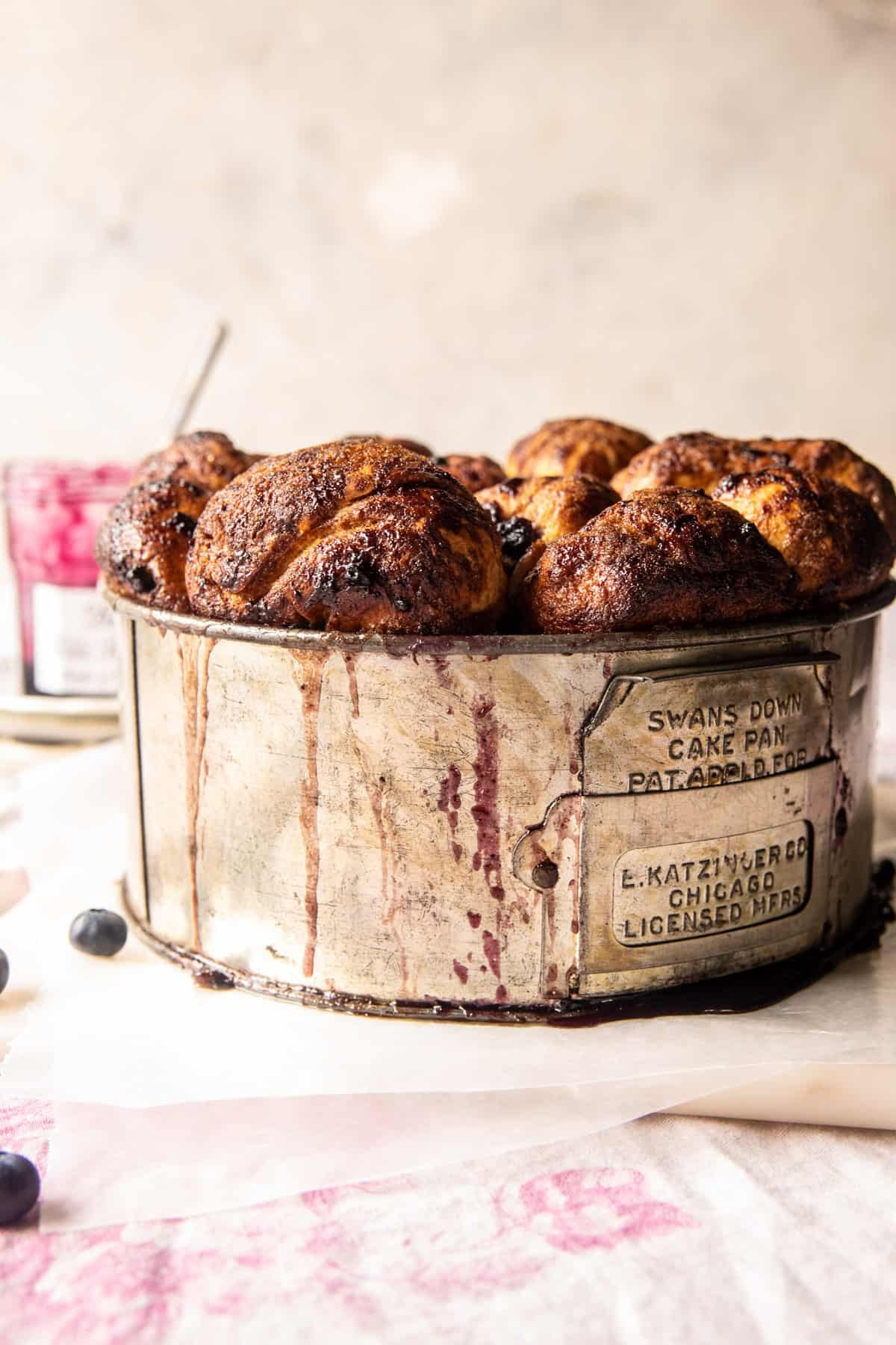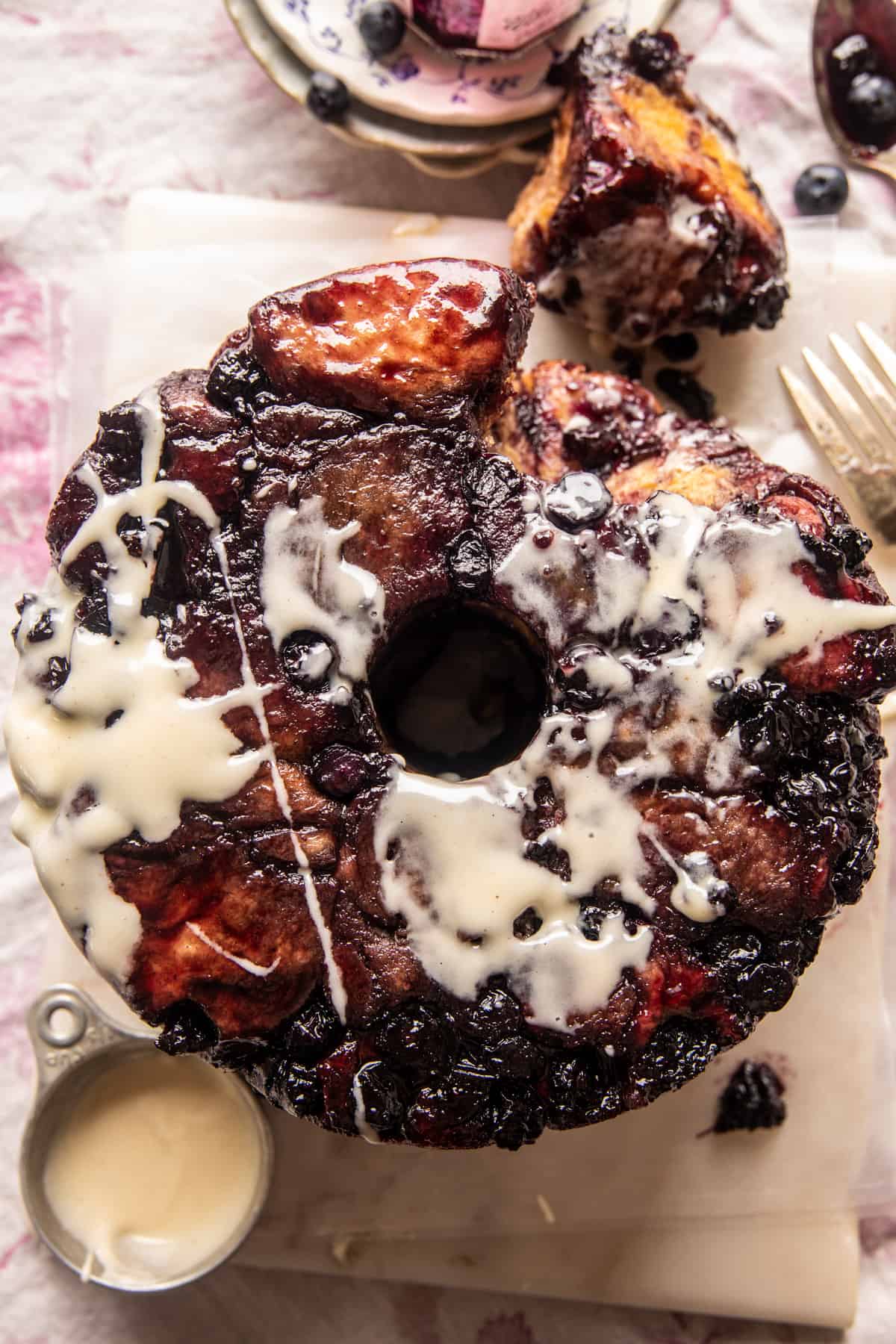 Arrange the balls in a bundt pan and layer them with blueberry jam and fresh blueberries. Nothing too fancy, but once baked up, it’s always impressive, and of course, so delicious.