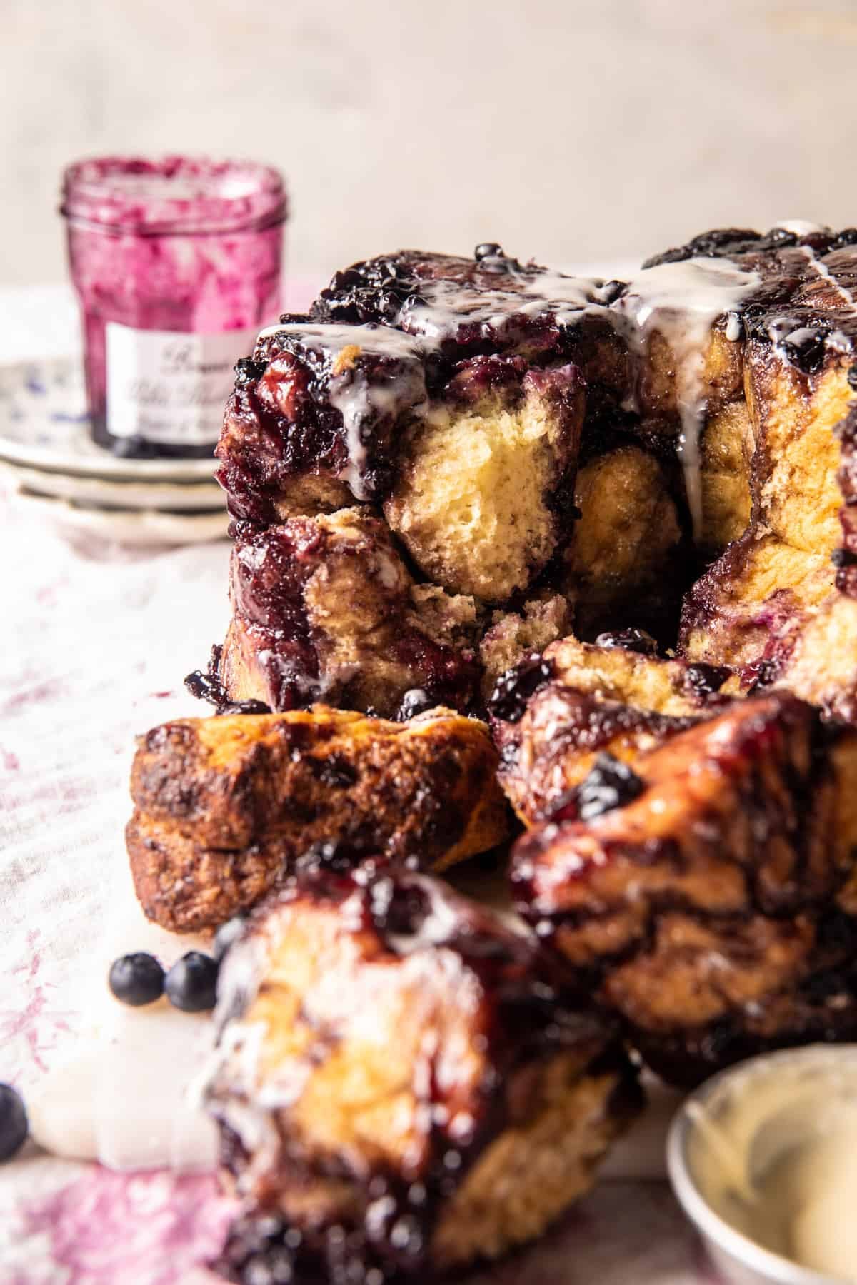 Easy Blueberry Monkey Bread. This is the monkey bread recipe you need for spring and summer days. Soft and fluffy dough balls coated with cinnamon sugar and sweet blueberry jam. Serve while warm, drenched with brown butter icing that melts into every nook and cranny. There’s nothing not to love, every doughy bite is full of sweet blueberry goodness. And the icing is just that, “icing on the cake”. So yummy.