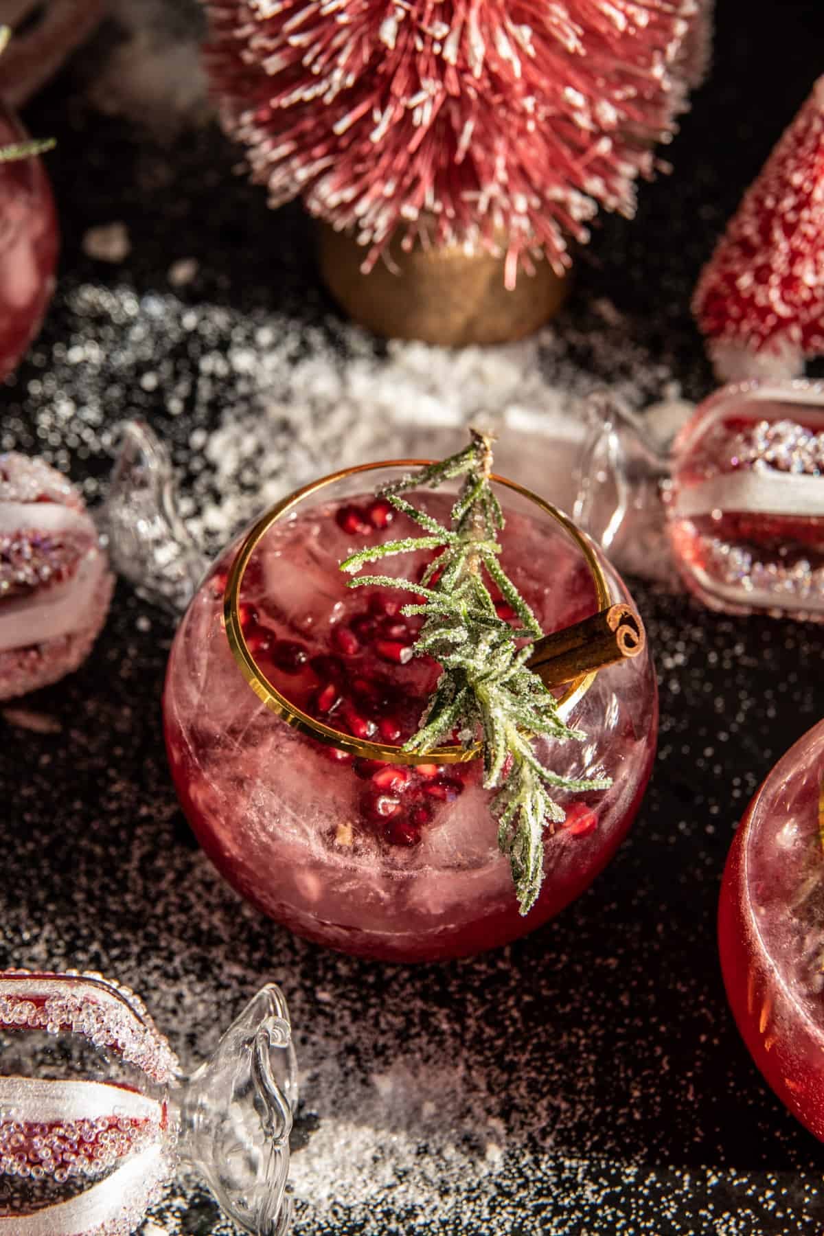 Sugared rosemary, pomegranate, and a cinnamon stick – my favorite cocktail garnishes to add to drinks this time of year, delicious and so pretty. I love the way these garnishes make the drink sparkle like snow!