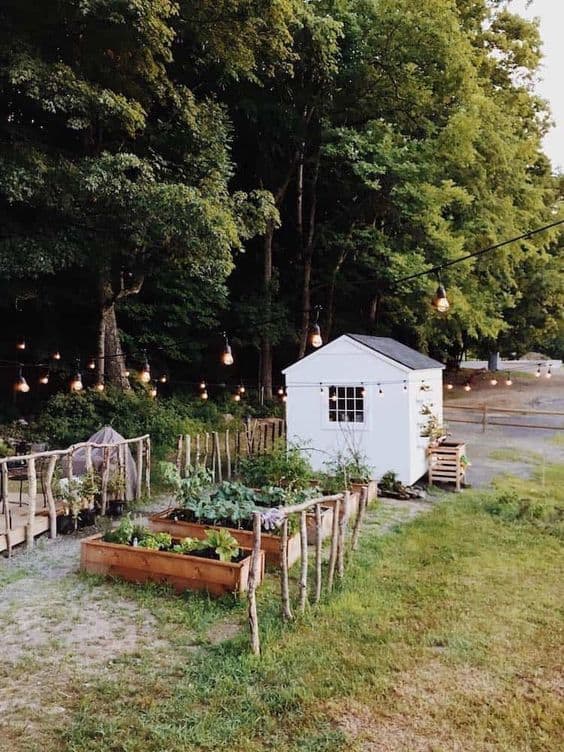 The little white potting shed with the cedar garden beds and the lights strung above is actually my photo. It popped up on my Pinterest feed today uncredited but should be credited to our Instagram @bramblefieldfarmhouse