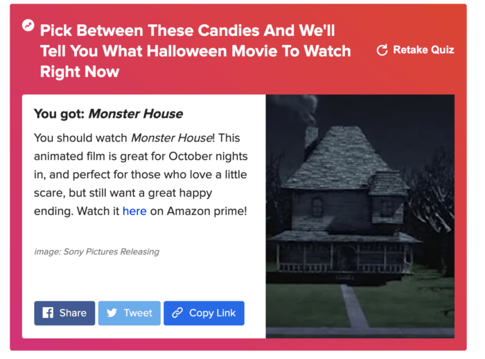 lovingโฆthis Halloween candy quiz that will tell you what Halloween movie to watch. My results were spot on, see below.
