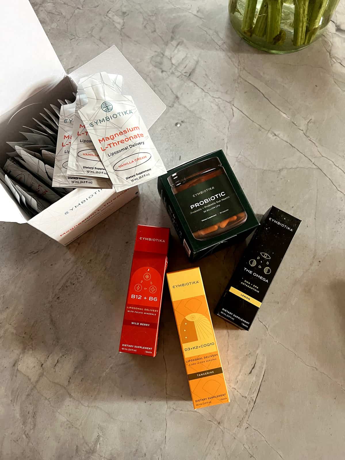 This is my core Cymbiotika line up. I take these while home and traveling – Vitamin B12 + BC (boosts energy, supports heart health, and generally is a vitamin most women are lacking) and Vitamin D3 + K2 + CoQ10 (supports immune health and strong bones by assisting in the regulation of calcium and cardiovascular health by reducing arterial plaque) and the Magnesium L-Threonate, plus probiotic.