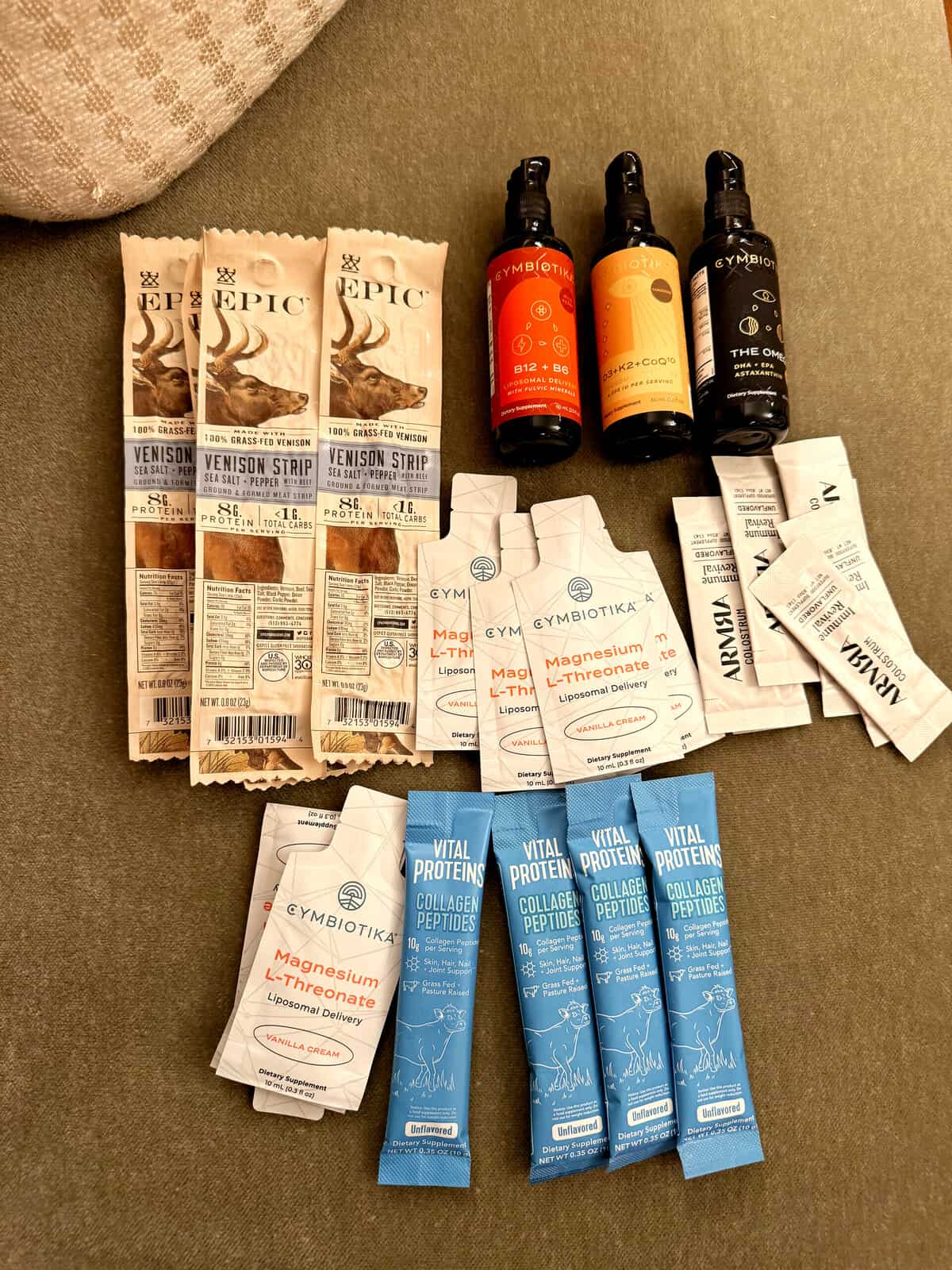 My travel go-toโs:ย Cymbiotika Magnesium L Threonate, Armra, Vital Proteins, Epic venison beef strips, and Cymbiotika B12, D3, and The Omega