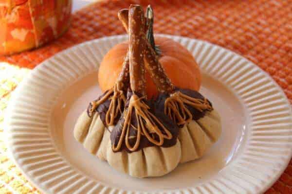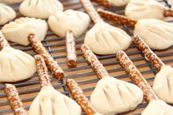 Take one of the cookie balls and press it onto the pretzel handle. It’s not necessary to wrap it all the way around the pretzel, just flatten the ball onto it. Once you’re happy with your broom shape, use a fork to press the bristle shapes into the cookie. You might need to reshape the cookie a little again after using the fork.